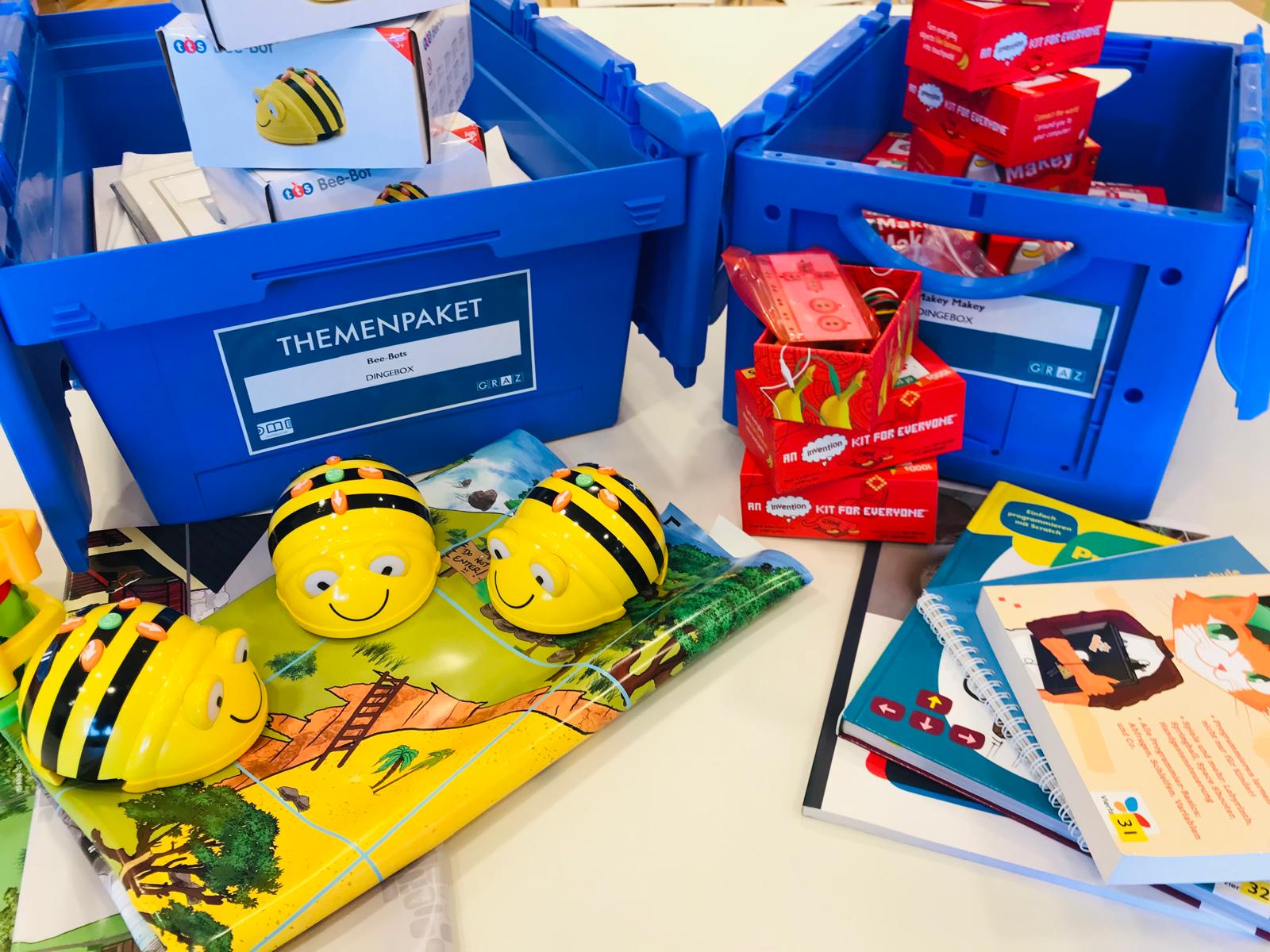 Unser Themenpaket-Service zählt mittlerweile schon mehr als 350 transportable Minibibliotheken, die Bildungseinrichtungen entleihen können. Nun gibt es nach „Dingeborg – der Bibliothek der Dinge“ auch Themenpakete mit Objekten: Die „Dingeboxen“ stellen vielfältiges Material für den Unterricht wie zum Beispiel Lernroboter und Lernspiele zur Verfügung.